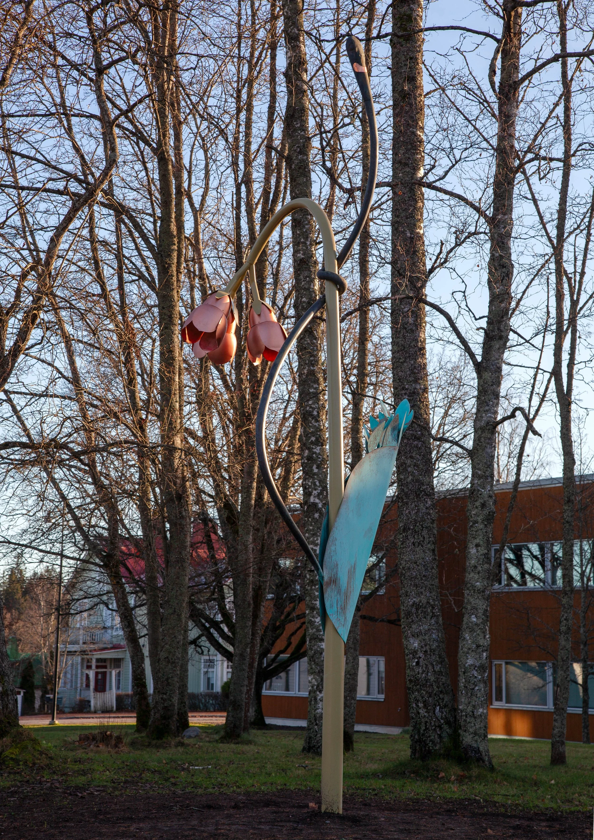 The plant elements of the sculpture are made primarily of copper. Copper is a warm-toned, antibacterial noble metal whose color varies depending on patination. In the work, copper appears both shiny and patinated in brown and green hues.